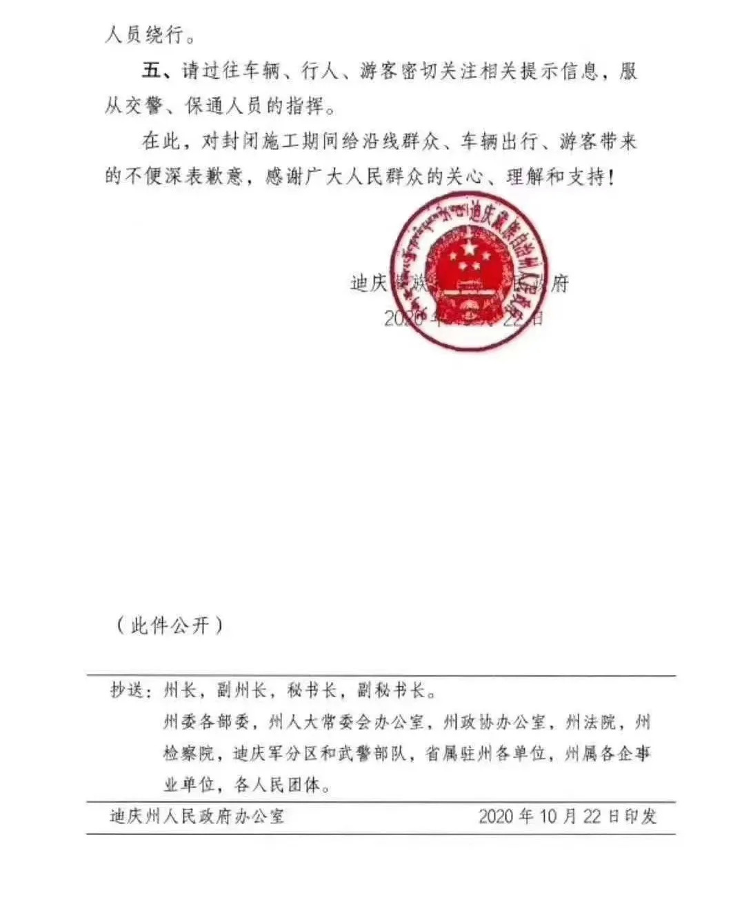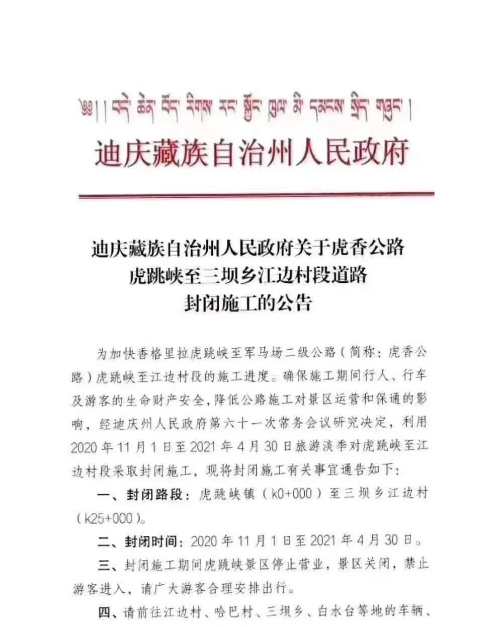 据云南省迪庆藏族自治州人民政府日前公告,为加快香格里拉虎跳峡至军马场二级公路虎跳峡至江边村段的施工进度,2020年11月1日至2021年4月30日旅游淡季对虎跳峡至江边村段采取封闭施工。封闭施工期间虎跳峡景区停止营业,景区关闭,禁止游客进入,前往江边村、哈巴村、三坝乡、白水台等地的车辆、人员绕行。