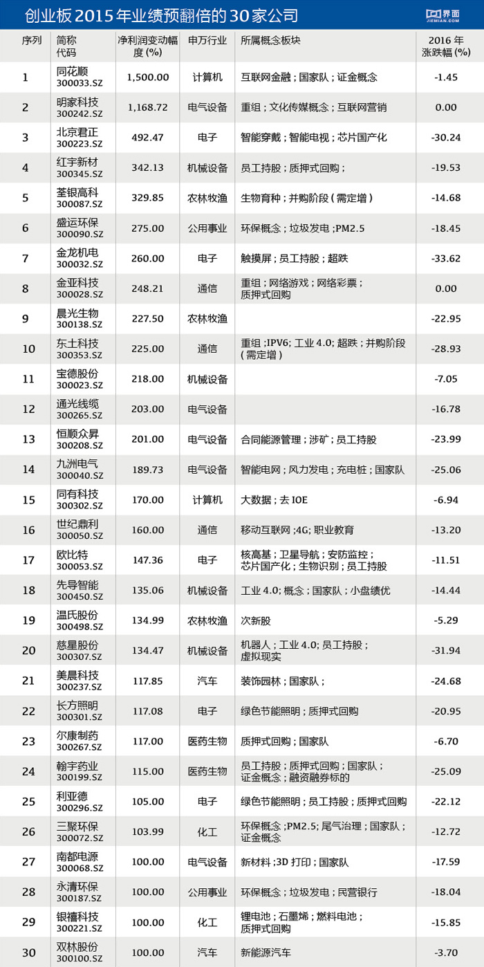 界面新闻统计了创业板公司2015年的整体业绩预告情况,有30家创业板公司预计2015年可实现净利润翻番。