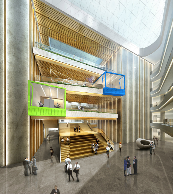 在每一楼层,建筑师将空间分割,以街区的形式连通。在街区之间设置开放式办公空间,方便员工会面交流。据腾讯内部人员向界面新闻记者介绍,每一个“街区”和“街道”的名称都将向腾讯员工征集。(腾讯员工开玩笑地说可以用北京的东直门、西直门、建国门等来命名街区,体验“在二环办公”的感觉。)