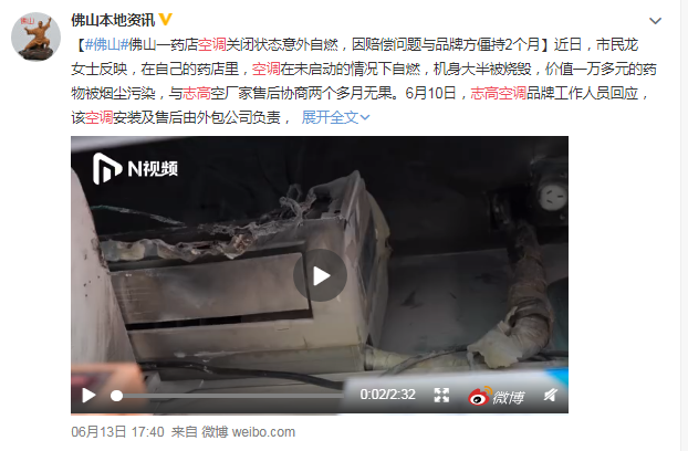 2020年6月,据《佛山本地资讯》报道,佛山一药店内使用的志高空调在关闭状态意外自燃。据当事人市民龙女士反映,在自己的药店里,空调在未启动的情况下自燃,机身大半被烧毁,价值一万多元的药物被烟尘污染,与志高空厂家售后协商两个多月无果。2020年6月10日,志高空调品牌工作人员回应,该空调安装及售后由外包公司负责,安装不符合规范。考虑此事持续时间较长,基于人道主义及本着负责任的态度,厂方愿无条件承担全责并给予赔偿。