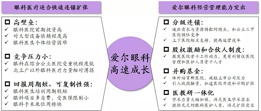 分级连锁模式、并购基金、合伙人机制等构筑了爱尔眼科的护城河;获取稀缺公立医院资源的能力,以及可复制性的经营模式,是“通策模式”成功的关键。