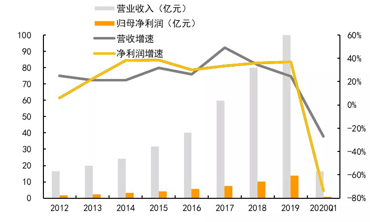 近年来,通策的业绩增速呈现连续下滑的态势。2017-2019年,实现总营收11.8亿、15.46亿、18.94亿,对应的总营收增速分别为34.25%、31.05%、22.52%,净利润增速也同步下滑。
