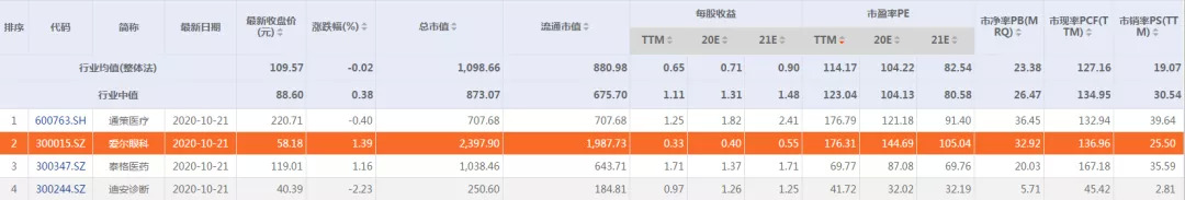 众所周知,目前两家公司的估值非常高。根据东方财富Choice数据显示,截至2020年10月21日,通策医疗市盈率TTM为176.79倍,爱尔眼科为176.31倍。