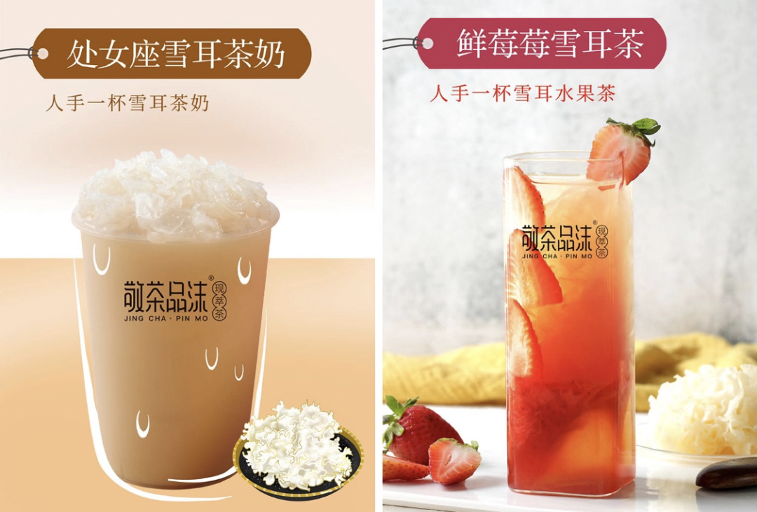 咖门曾报道过的在县城开店的敬茶品沫,最近也推出两款新品——处女座雪耳茶奶、鲜莓莓雪耳茶,连下沉市场都卖起了银耳。