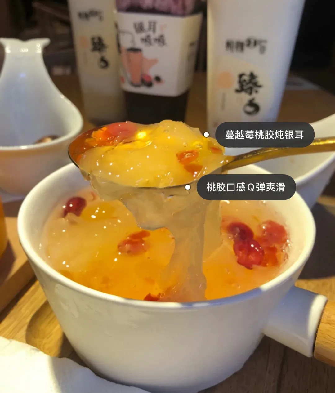 搭配上:许多品牌在使用中,银耳和桃胶同时出现。二者长相、口感都很相似,桃胶可以提升银耳的价值感。