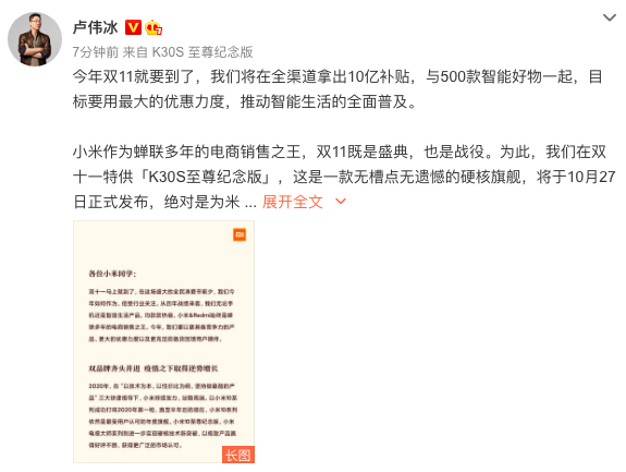 小米集团副总裁卢伟冰:小米将在全渠道拿出10亿补贴