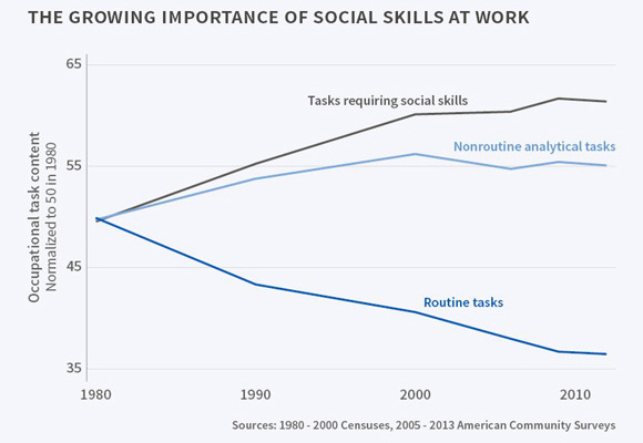 美国国家经济研究局(National Bureau of Economic Research)最近发布的工作报告也佐证了这一点,那些要求人们数学能力更高而对社交能力要求更低的职位,提供给人们的工作机会减少了;社交技能却在劳动力市场发挥着越来越大的作用。