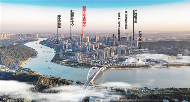南宁前海人寿金融中心南面是1380亩五象湖公园、西望13410亩五象岭森林公园,北眺百里邕江公园带。对望城市山水景观主轴,直面邕江、青秀山龙象塔和水月庵。拥享江、山、公园等多重景观,收藏城市的碧江帆影、霓虹璀璨。