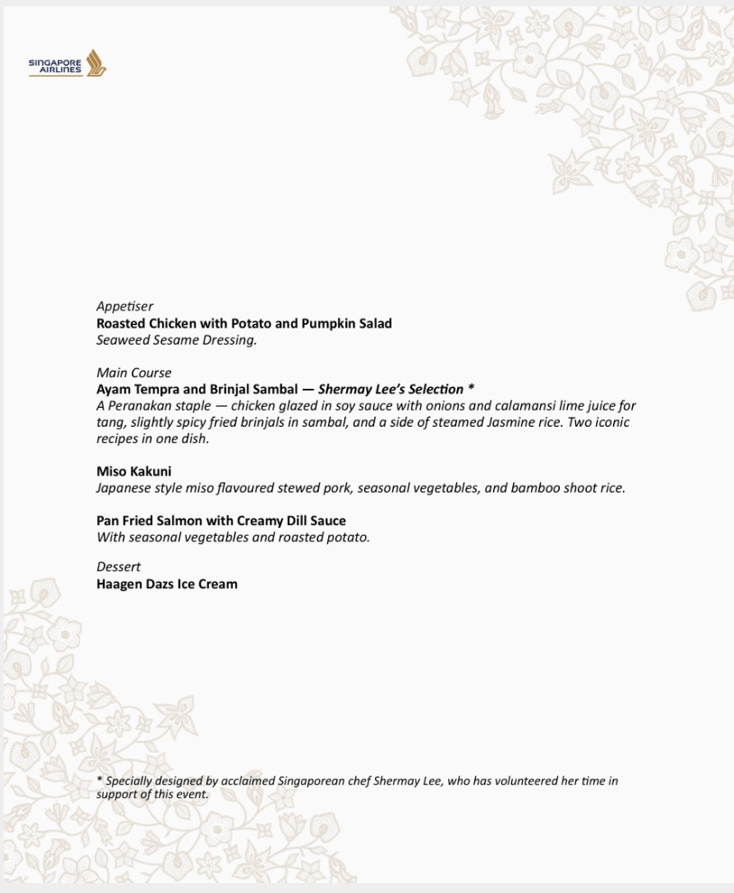 具体菜品可由旅客通过菜单自主选择,新加坡航空方面介绍,食客可以从各级客舱等级中挑选自己喜爱的特殊菜单,菜单内既有新航国际招牌美食也有备受赞誉的新加坡娘惹菜肴,所有食客将获得KrisShop折扣优惠,如果他们身穿传统服饰,还将获赠一个限量版的手提袋及额外礼品。