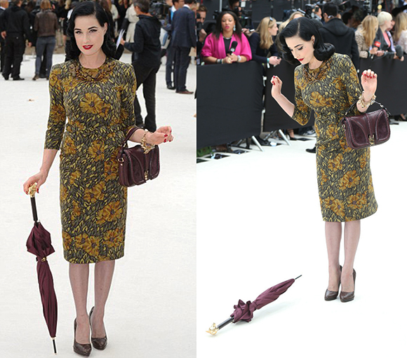 即便你对 Dita Von Teese 的全名以及她“世界第一脱衣舞娘”这个头衔并不熟悉,你也一定见过那张在 Burberry 秀场上掉伞、被两位男士争相抢着捡起的照片。她被称作是“将高贵和情色完美的融为一体”的女人——乌黑的卷发、红唇白雪的复古配上标志性的蜂腰,这一切让 Dita Von Teese 成为好莱坞一块不倒的招牌。