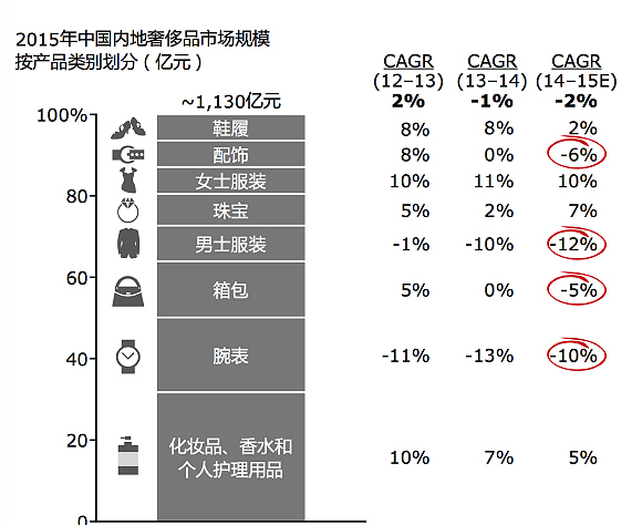 贝恩咨询公司最新发布的报告显示,中国奢侈品销售额 2015 年出现了约 2%的下滑,市场规模从上一年的 1150 亿元降至 1130 亿元。在过去一年间中国奢侈品市场的惨淡表现印证了一件事情:2014 年 1%的负增长并非一时失手,欧美大牌无往不利的好光景已成过去。
