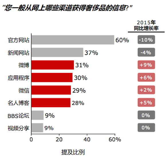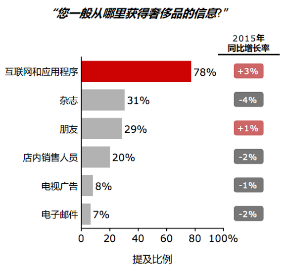 如今已经很难找出抗拒网络的奢侈品牌了。从贝恩调研数据来看,78%的受访者通过互联网和应用程序获得奢侈品信息。在网络细分渠道中,微博、应用程序、微信和名人博客的使用率不断提升,传统的官方网站和新闻网站正呈现下滑态势。