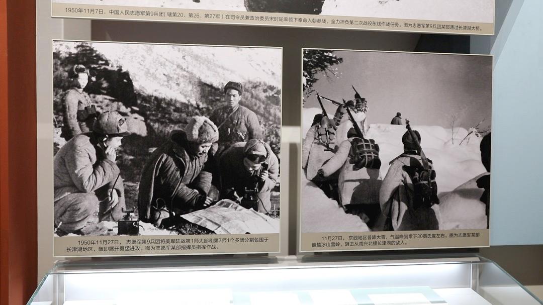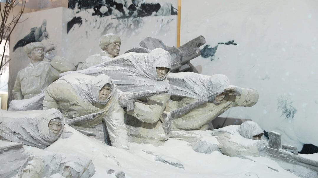展厅内,特别摆放着一组“鏖战长津湖”的景观。1950年11月27日,在东线,叫嚣着“要在圣诞节前结束战争”的美军主力进入志愿军伏击地域。闻名于世的“长津湖之战”,在当天傍晚的飞雪中打响。