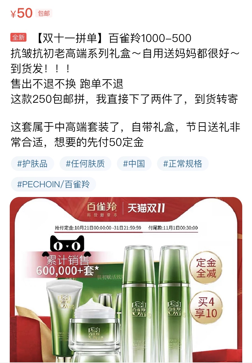 以百雀羚的抗皱抗初老高端系列礼盒为例,闲鱼上有不少用户都在转售这款商品,原因是下单两件优惠力度更大,两人平摊之后,每人只需支付250元就能获得预售价509元的礼盒。