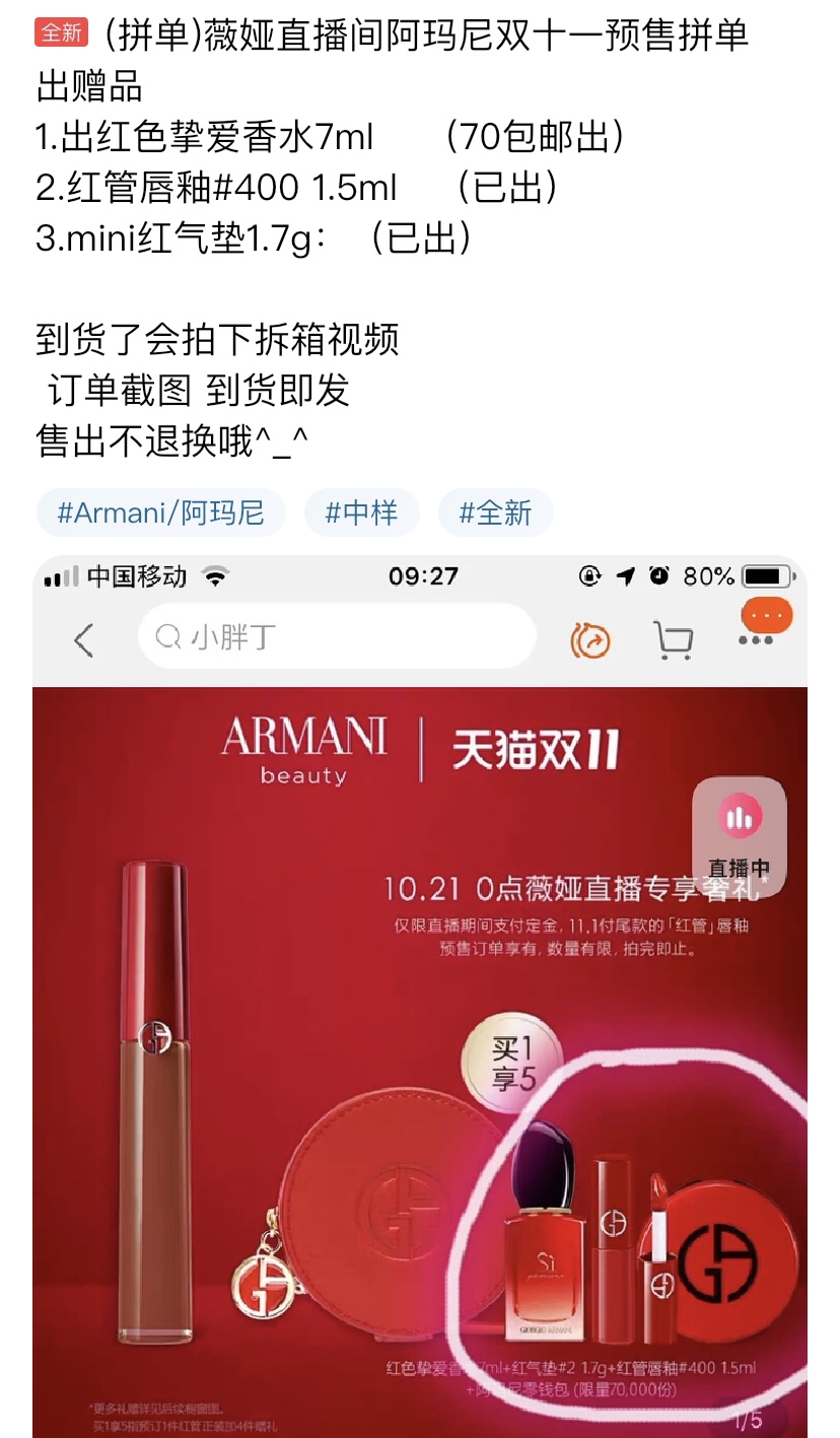 还有一大部分人是在出售小样。界面时尚看到,不少闲鱼用户都在转售阿玛尼美妆的赠品小样。以薇娅在10月21日直播的阿玛尼红管唇釉为例,这款商品双11期间的价格为原价310元,但会额外赠送1个阿玛尼零钱包、1个7ml红色挚爱香水7ml、2个1.7g红气垫、1个1.5ml红管唇釉。