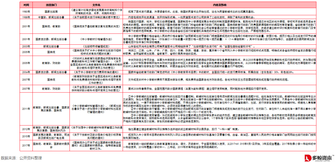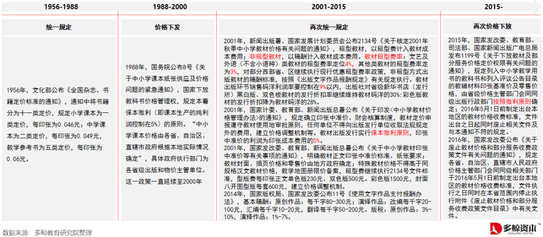 自 1956 年建国初期我国便制定了教材教辅相关政策,其产品定价权经历一系列的政策调整,目前遵循的政策是 2015 年 6 月由国家发改委、教育部等四部门出台的《关于下放教材及部分服务价格定价权限有关问题的通知》,规定由省级价格主管部门会同同级出版行政部门按照微利原则确定中小学教材教辅的基准价格和零售价格。