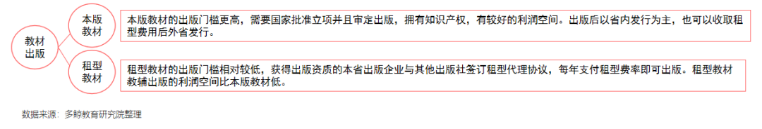 租型教材的出版门槛相对较低,获得出版资质的本省出版企业与其他出版社签订租型代理协议,每年支付租型费率即可出版。租型教材教辅出版的利润空间比本版教材低。
