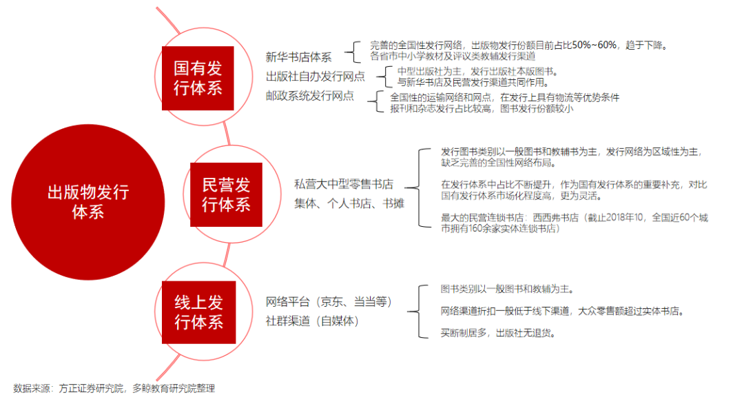 具有图书批发资质的发行商从出版社购入图书、并销售给下游分销商,取得发行收入。主要发行渠道包括省级新华书店发行集团、邮政系统、民营发行企业、线上发行渠道等。