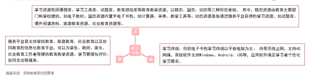 电子书包是指计算机、上网本、专用阅读器等电子设备,就是将学生书包里的教材、作业本、课内外读物、字典等全部数字化后,整合在一个轻便的移动终端中。电子书包功能丰富,除了传统家校通包含的家校沟通功能,电子书包还提供更加丰富的教育信息化功能。电子书包是一个“云、管、端”一体化的系统,包括云端上的各种教育服务和资源,连接各种设备和传输数据的接入网络,以及承载教育服务的学习终端。