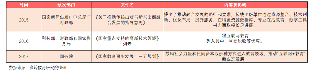 国务院、教育部等相关部门近些年出台多项政策,鼓励教育行业积极应用现代信息技术,促进出版业的转型与数字化发展。