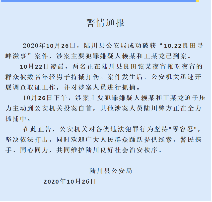 据广西玉林市陆川县公安局通报,10月26日,陆川县公安局成功破获“10.22良田寻衅滋事”案件,涉案主要犯罪嫌疑人赖某和王某龙已到案。10月22日凌晨,两名正在陆川县良田镇某夜宵摊吃夜宵的群众被数名年轻男子持械打伤。案件发生后,公安机关迅速开展调查取证工作,并对涉案人员进行抓捕。10月26日下午,涉案主要犯罪嫌疑人赖某和王某龙迫于压力主动到公安机关投案自首,其他涉案人员陆川警方正在全力抓捕中。