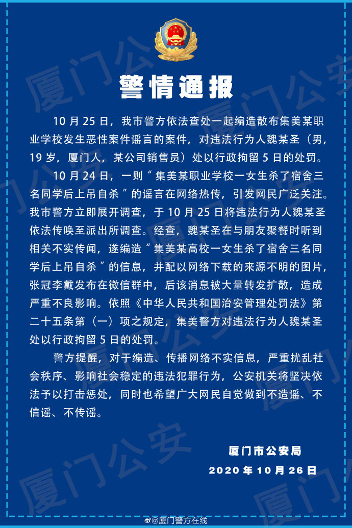 据福建省厦门市公安局官方微博10月26日通报,10月25日,厦门市警方依法查处一起编造散布集美某职业学校发生恶性案件谣言的案件,对违法行为人魏某圣(男,19岁,厦门人,某公司销售员)处以行政拘留5日的处罚。