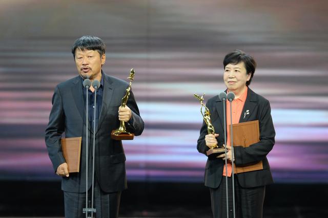 10月18日,孔笙凭借《大江大河》获得金鹰奖最佳导演奖、马继红(右)凭借《外交风云》获得最佳编剧奖。新华社记者陈振海 摄