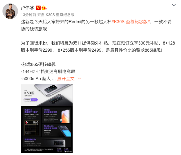 小米集团副总裁卢伟冰今日在微博上表示,Redmi K30S 至尊纪念版双11预订提供300元补贴,8+128版本到手价2299, 8+256版本到手价2499