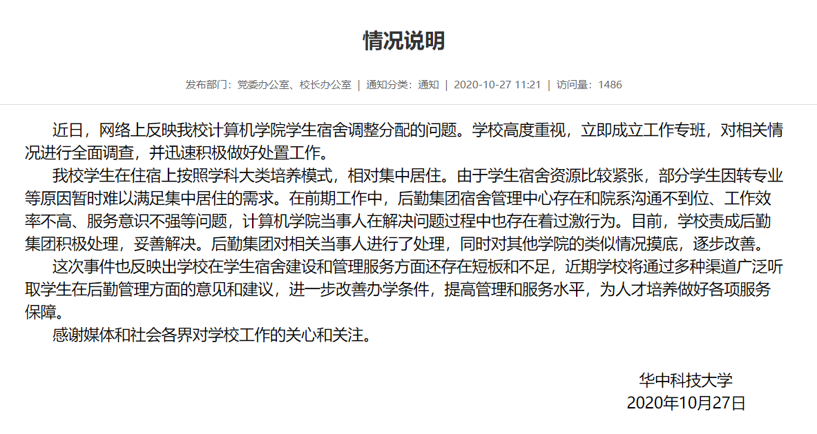 据华中科技大学网站10月27日消息,近日,网络上反映学校计算机学院学生宿舍调整分配的问题。学校高度重视,立即成立工作专班,对相关情况进行全面调查,并迅速积极做好处置工作。