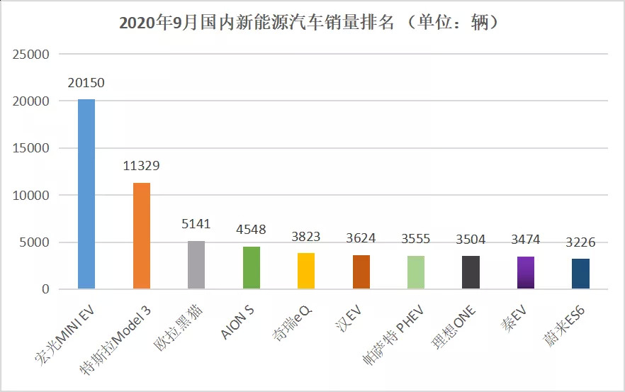 2020年9月国内新能源汽车销量排名,数据来自乘联会,连线Insight制图