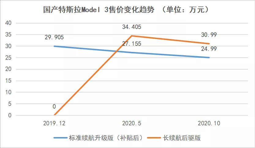 而在五个月后,十一期间国产Model 3标准续航升级版补贴后售价从27.155万元降至24.99万元,国产长续航后驱版售价从34.405万元降至30.99万元。