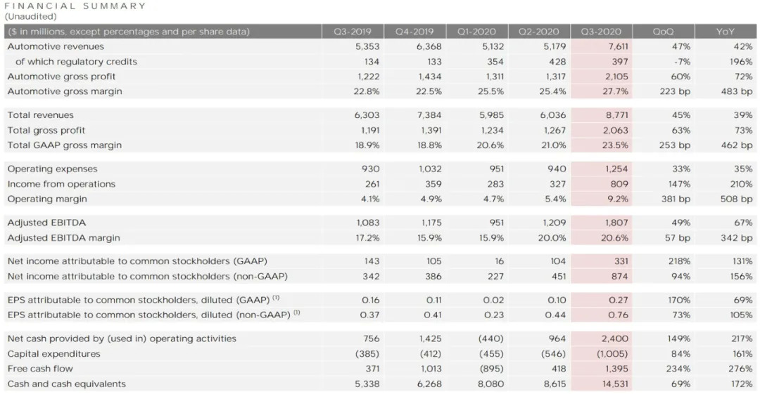 近期,特斯拉发布了2020年第三季度财报,而这一季度也被埃隆 马斯克称为“历史上最好的季度”。财报显示,特斯拉报告期内营收同比增长39%至87.71亿美元,净利润为3.31亿美元,同比增长131%,这也是特斯拉连续第五个季度实现盈利。