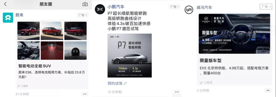 蔚来、小鹏和威马汽车的朋友圈广告,连线Insight制图