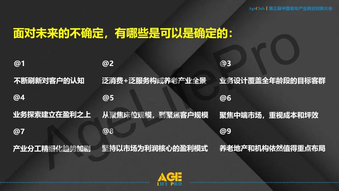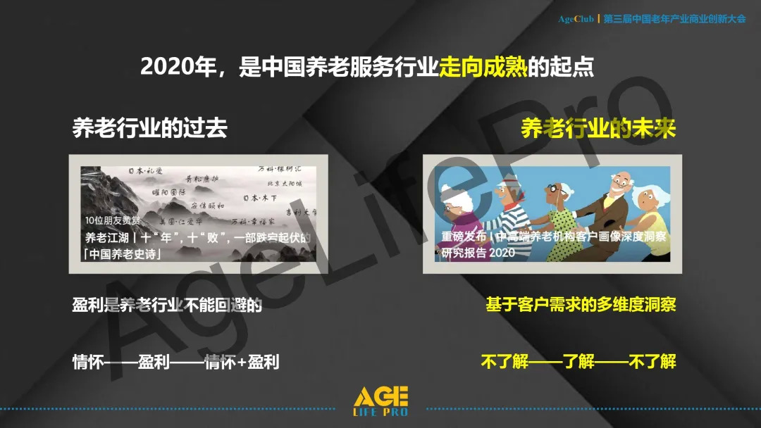 AgeLifePro认为:无论是对盈利的深入探索,还是对客户需求的高度重视,都标志着中国养老产业正在远离浮躁,走向成熟,而这个成熟的起点,我们认为就是2020年。