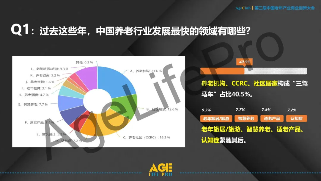 过去这些年,从业者普遍认为,养老机构、CCRC、社区居家是中国养老产业发展最快的3个领域,总占比达到40.5%,AgeLifePro称之为养老服务的“三驾马车”,这个结论也符合我们对养老产业的固有认识。