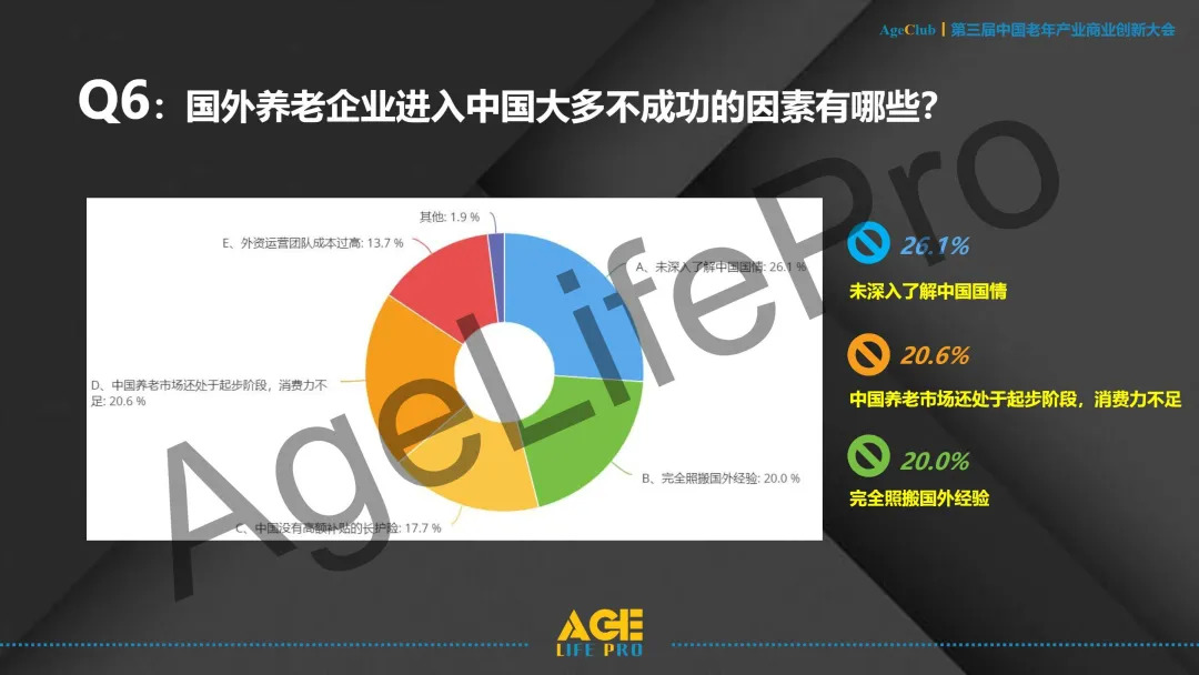 过去这些年,以日本为主的国外养老企业、养老品牌大举进军中国市场,但在经营维度上几乎没有成功案例,从业者普遍认为,这背后的主要3个原因是:未深入了解中国国情(占比26.1%)、中国养老市场还处于起步阶段,消费力不足(20.6%)、完全照搬国外经验(占比20.0%)。