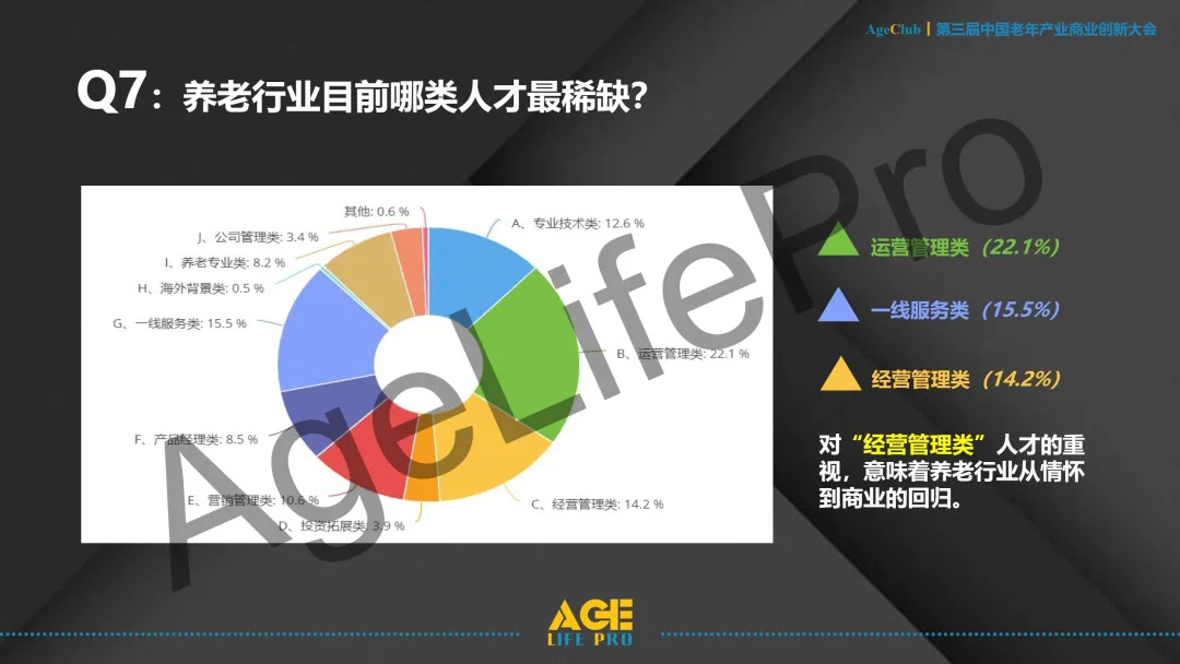 人才,是全世界养老产业的共性痛点,从业者普遍认为:运营管理类(占比22.1%)、一线服务类(占比15.5%)、经营管理类(占比14.2%)是最稀缺的3类人才。