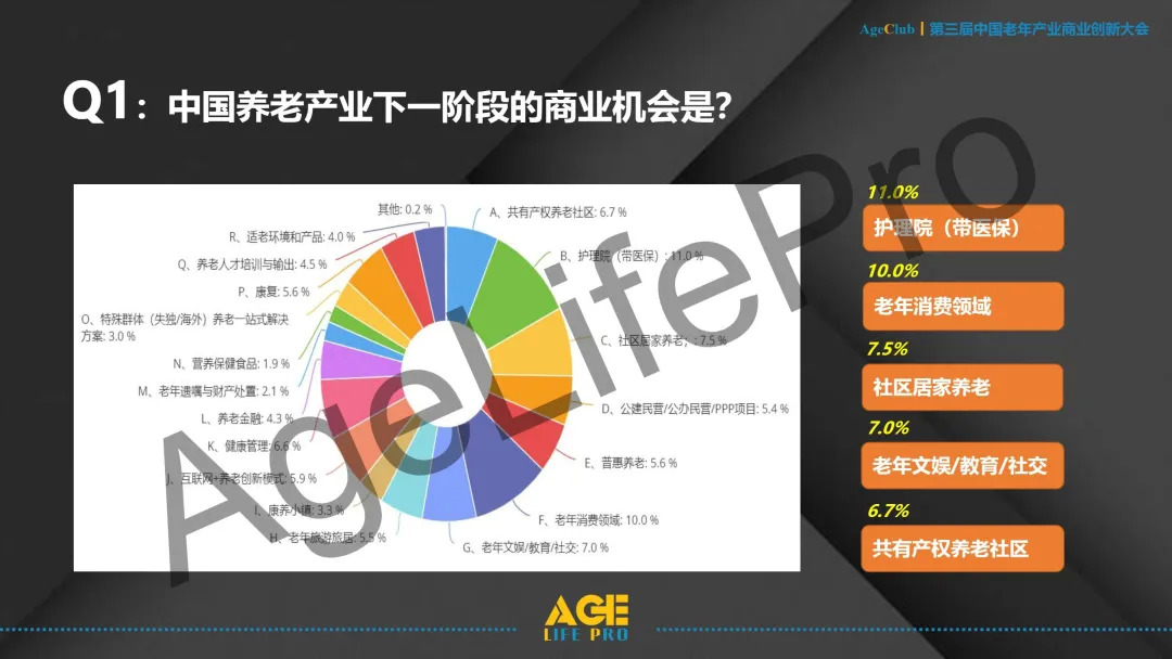 从业者普遍认为,下一阶段,中国养老产业蕴藏巨大的商业机会,其中排名前5的是:护理院(11.0%)、老年消费领域(10.0%)、社区居家养老(7.5%)、老年文娱/教育/社交(7.0%)、以及共有产权养老社区(6.7%)。此外,健康管理、老年旅游旅居、公建民营/公办民营/PPP项目等也排名较为靠前。