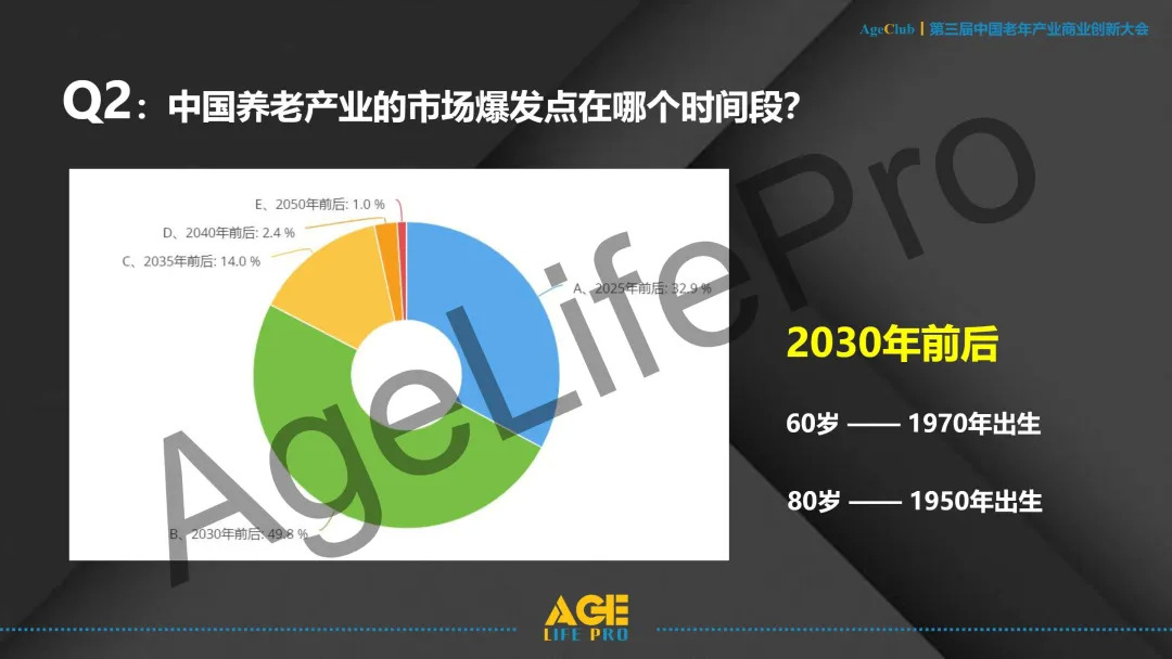 从业者普遍认为,中国养老产业最有可能的市场爆发点会在“2030年前后”,有接近50%的被调查者选择这个选项。