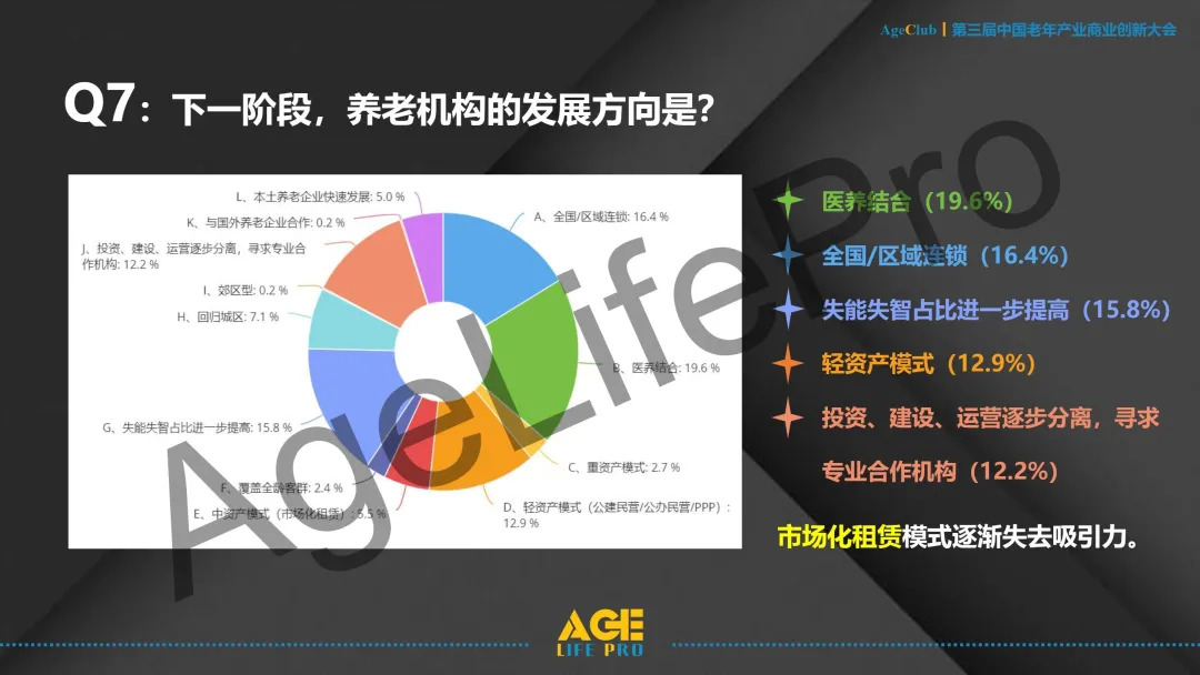 在可见的未来,养老机构依然会是中国养老服务产业的“中坚力量”,而:医养结合(19.6%)、全国/区域连锁(16.4%)、失能失智占比进一步提高(15.8%)、轻资产模式(12.9%)、以及投资、建设、运营逐步分离,寻求专业合作机构(12.2%)是被从业者普遍认可的5个发展方向。
