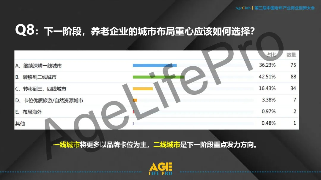 下一阶段,养老企业该如何进行全国布局?从业者普遍认为:“转移到二线城市(42.51%)”是大势所趋,但同时,也有36.23%的从业者选择了“继续深耕一线城市”。