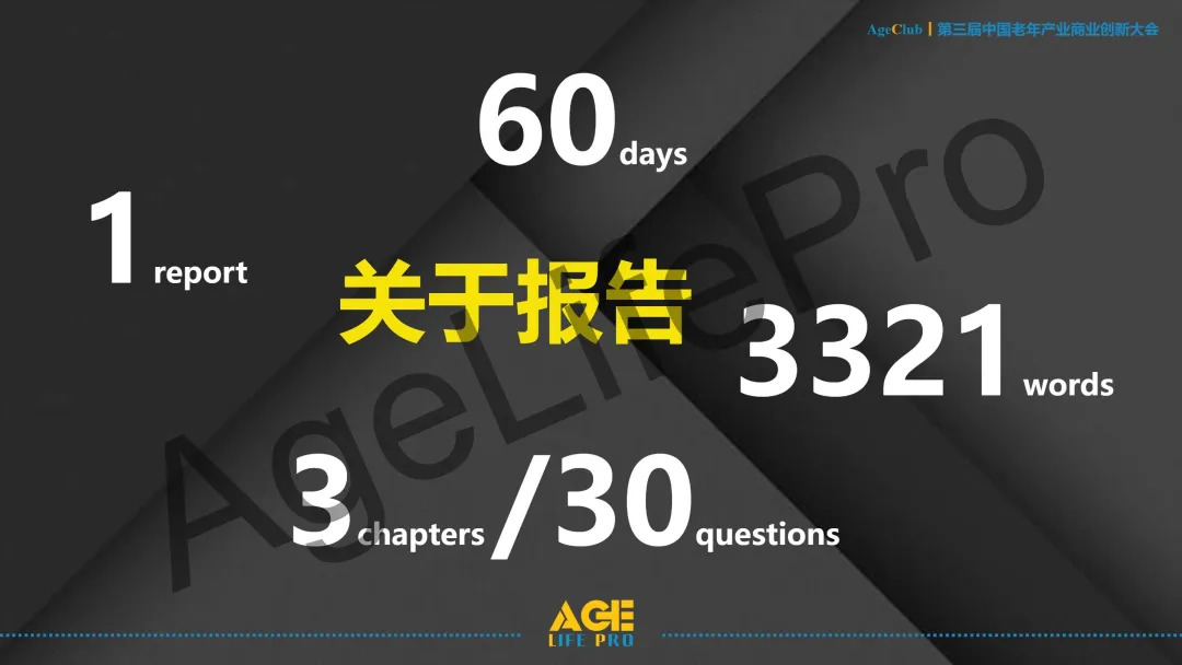 “3/30”:整个报告由3个章节和30个问题组成,3个章节分别是:被调研者画像、中国养老产业过往回顾、以及中国养老产业未来展望,每个章节各涉及10个问题;