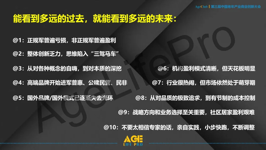 在这一章节,我们通过10个问题,系统性地回顾了中国养老产业这十年来最重要的一些命题,这其中既有正面,也有负面,AgeLifePro认为,成功固然可喜,但如果能直面失败,找到背后的真实原因,找到对策,对中国养老产业的未来发展可能更有意义,因为一切才刚刚开始。