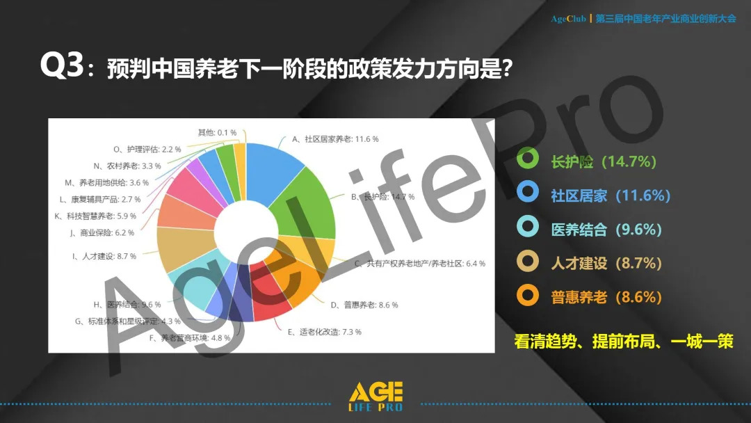 关于中国下一阶段的养老政策发力方向,从业者普遍认为是:长护险(14.7%)、社区居家(11.6%)、医养结合(9.6%)、人才建设(8.7%)、以及普惠养老(8.6%)。