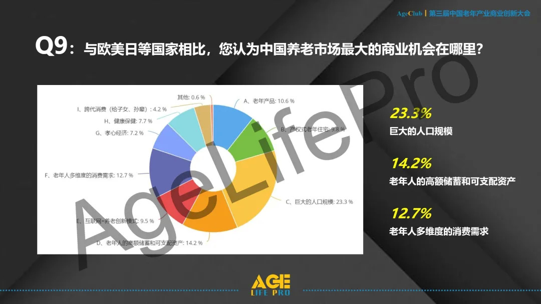 相比于欧美日等发达国家,从业者普遍认为中国养老市场蕴藏巨大的商业机会,这其中:巨大的人口规模(23.3%)、老年人的高额储蓄和可支配资产(14.2%)、以及老年人多维度的消费需求(12.7%)排名前三甲。