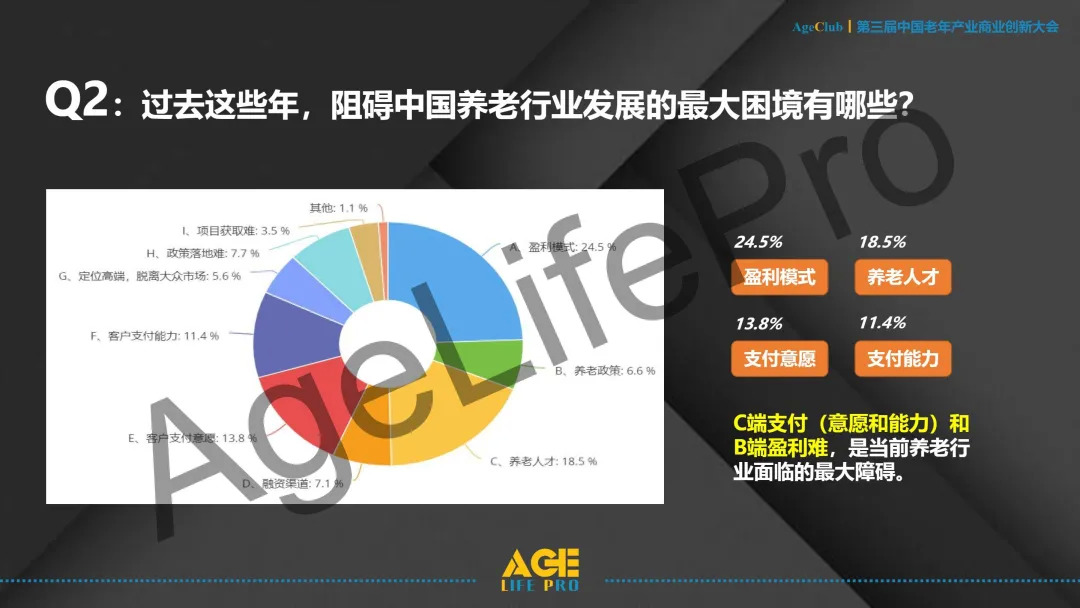 过去这些年,从业者普遍认为,阻碍中国养老产业发展的最大困境依然是“支付问题”,总占比达到25.2%,其中“支付意愿”占比13.8%,高于“支付能力”的11.4%,其次是“盈利模式”和“养老人才”,分别占比24.5%、18.5%,“为全社会建立起社会化的养老消费意识”是中国政府和养老企业下一阶段的共同课题。