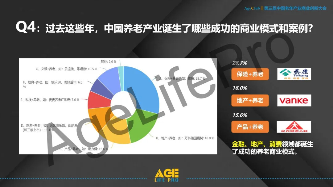 过去这些年,从业者普遍认为,以泰康为代表的“保险+养老”模式、以杭州万科随园嘉树为代表的“地产+养老”模式、以及以足力健为代表的“产品+养老”模式,是中国养老产业最成功的3个商业模式和代表案例,分别占比28.7%、18.0%、15.6%。