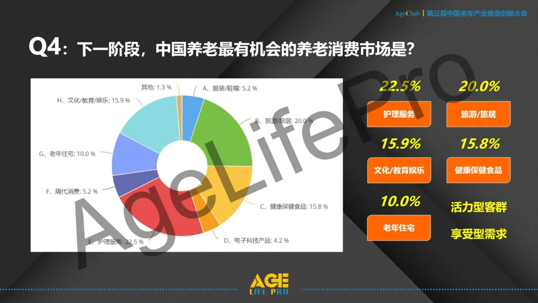 养老消费市场是继养老服务市场之后,从业者普遍看好的新方向,在养老消费领域,从业者普遍认为:护理服务(22.5%)、旅游/旅居(20.0%)、文化/教育娱乐(15.9%)、健康保健食品(15.8%)、以及老年住宅(10.0%)是值得布局的5个细分领域。