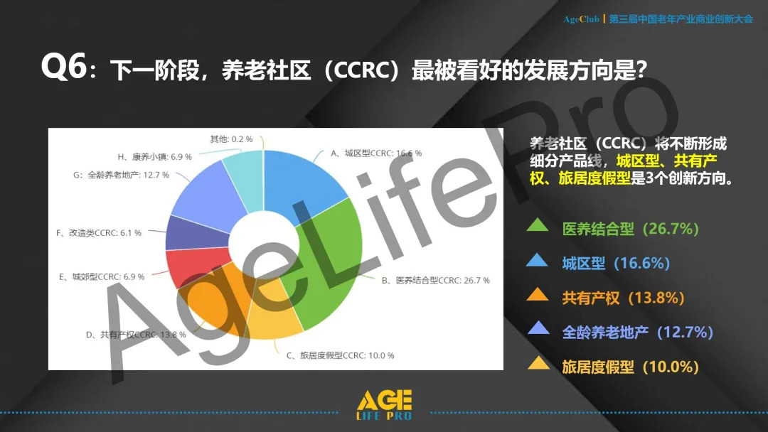 此外,养老社区(CCRC)的另一个趋势是将更加细分,其中,从业者普遍看好的5个细分方向分别是:医养结合型(26.7%)、城区型(16.6%)、共有产权(13.8%)、全龄养老地产(12.7%)、以及旅居度假型(10.0%)。