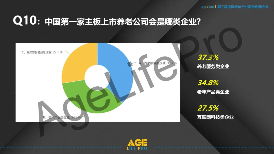最后一个问题是关于美好的未来,虽然近些年已有20余家新三板养老概念上市公司,但主板上市依然是中国养老产业最值得期待的,从此次调研结果看,无论是:养老服务类企业(37.3%)、老年产品类企业(34.8%),还是互联网科技类企业(27.5%),在养老的赛道上,都有望诞生第一家主板上市公司。